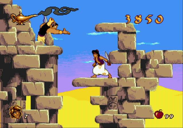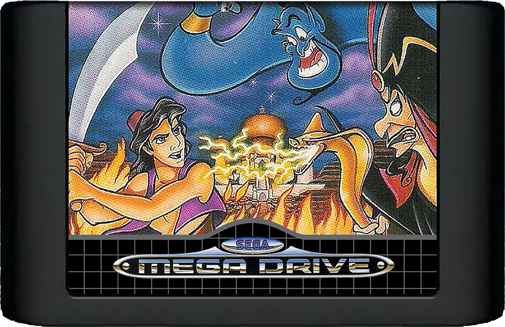 SEGA präsentiert eine brilliante, Disney/Virgin Games Koproduktion von Disney`s Aladdin. Haltet euch am Teppich fest, jetzt kommen Spaß, Abenteuer, Fantasie und Action! Aladdin schwingt seinen glänzenden Krummsäbel, um sich den Weg durch Agrabah zu erkämpfen, aus dem Verlies des Sultans zu entkommen, die flammende Höhle der Wunder zu überleben, sich die Wunderlampe zu schnappen und Prinzessin Yasmin vom bösen Jafar zu retten.
